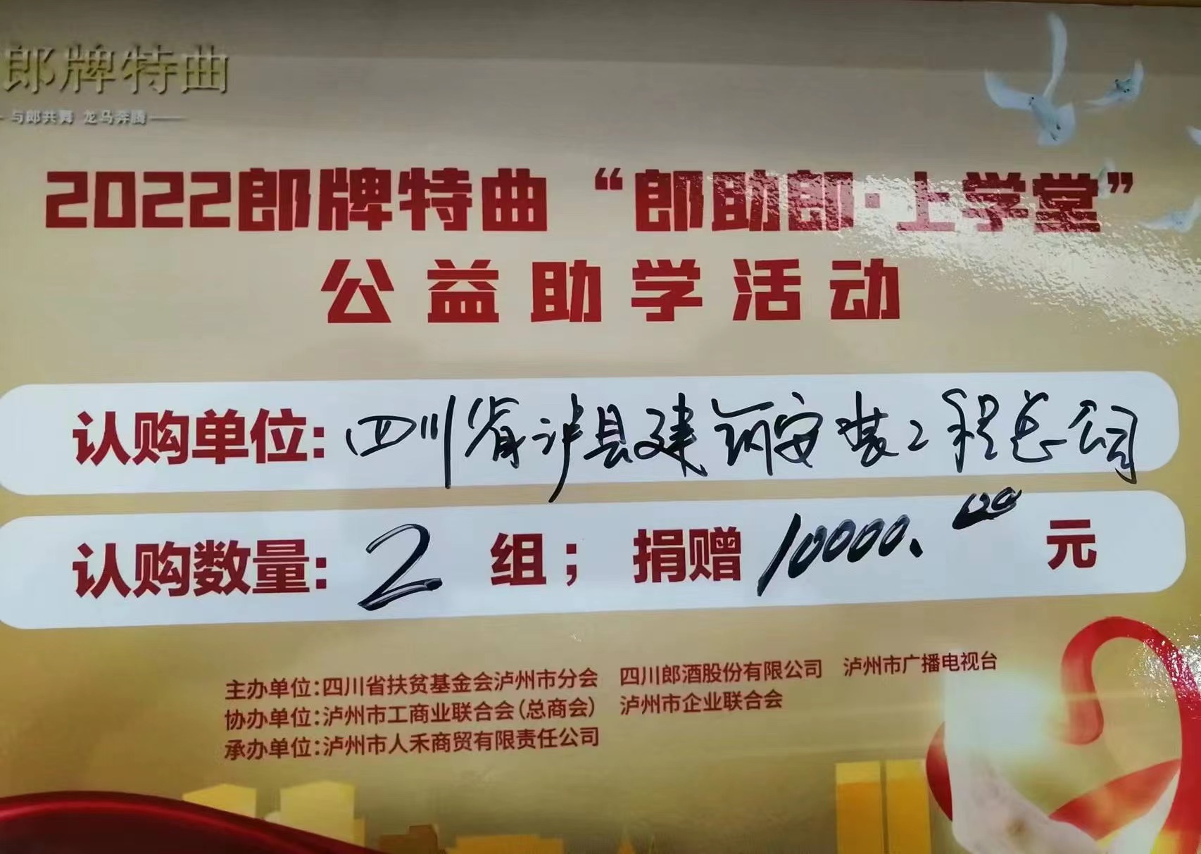 2022年6月17日上午,本次義賣活動如期舉行。四川省瀘縣建筑安裝工程總公司也參加了此次活動,并認購了兩組價值一萬元的郎酒。為貧困學子撐起一片愛的藍天。